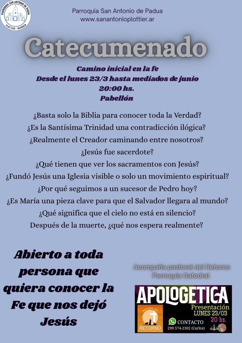Catecumenado: espacio de profundización de la fe destinado especialmente para los adultos sin bautismo. Abierto a todo quien quiera profundizar la Fe. Duración de tres meses aproximadamente.