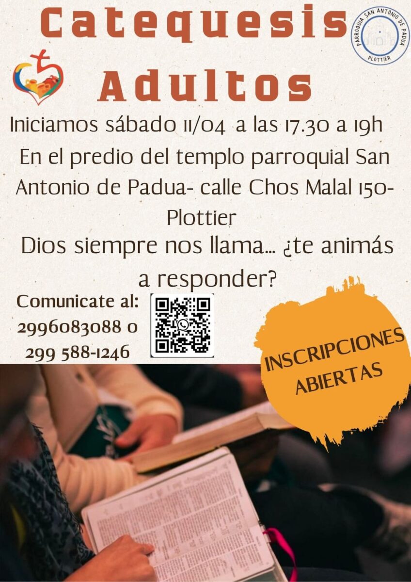Catequesis de Adulto: catequesis para adultos +33. Orientada a los sacramentos de iniciación. Sábados 17:30 a 19:00 hs. Te podés inscribir también