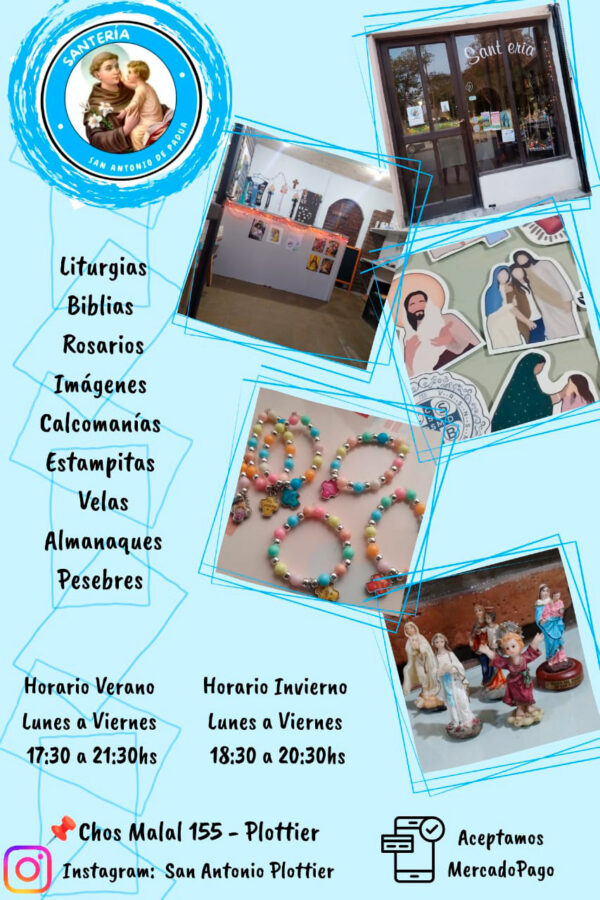 Liturgias, Biblias, Rosario, Imágenes, Calcomanías, Estampitas, Velas, Almanaques, Pesebres.